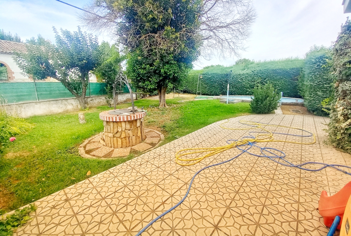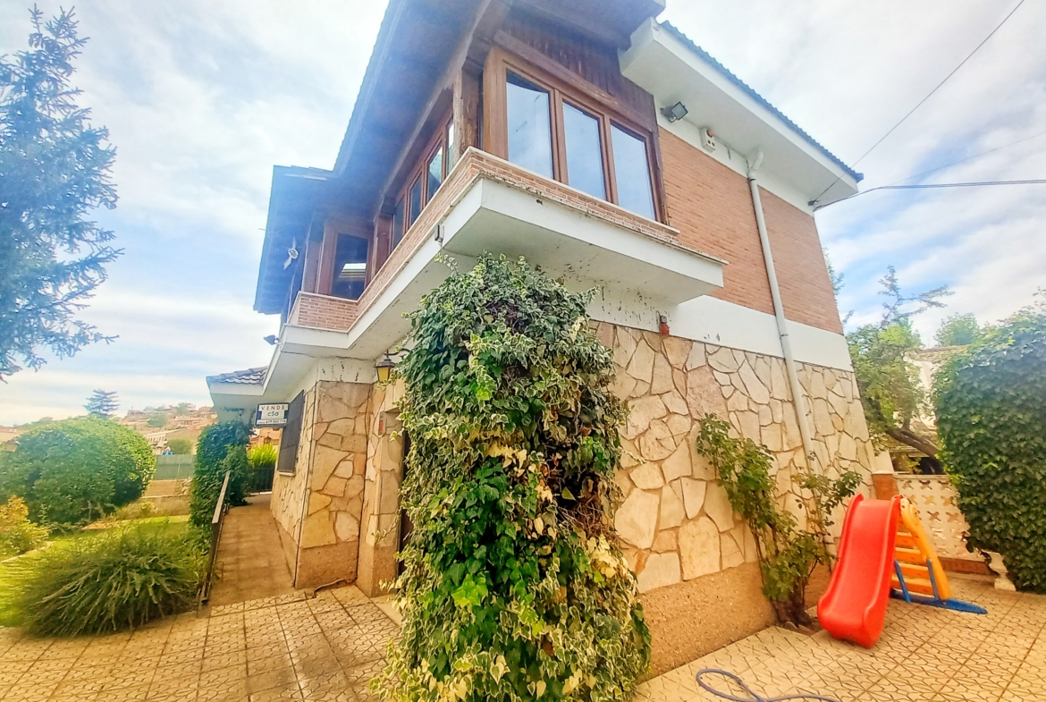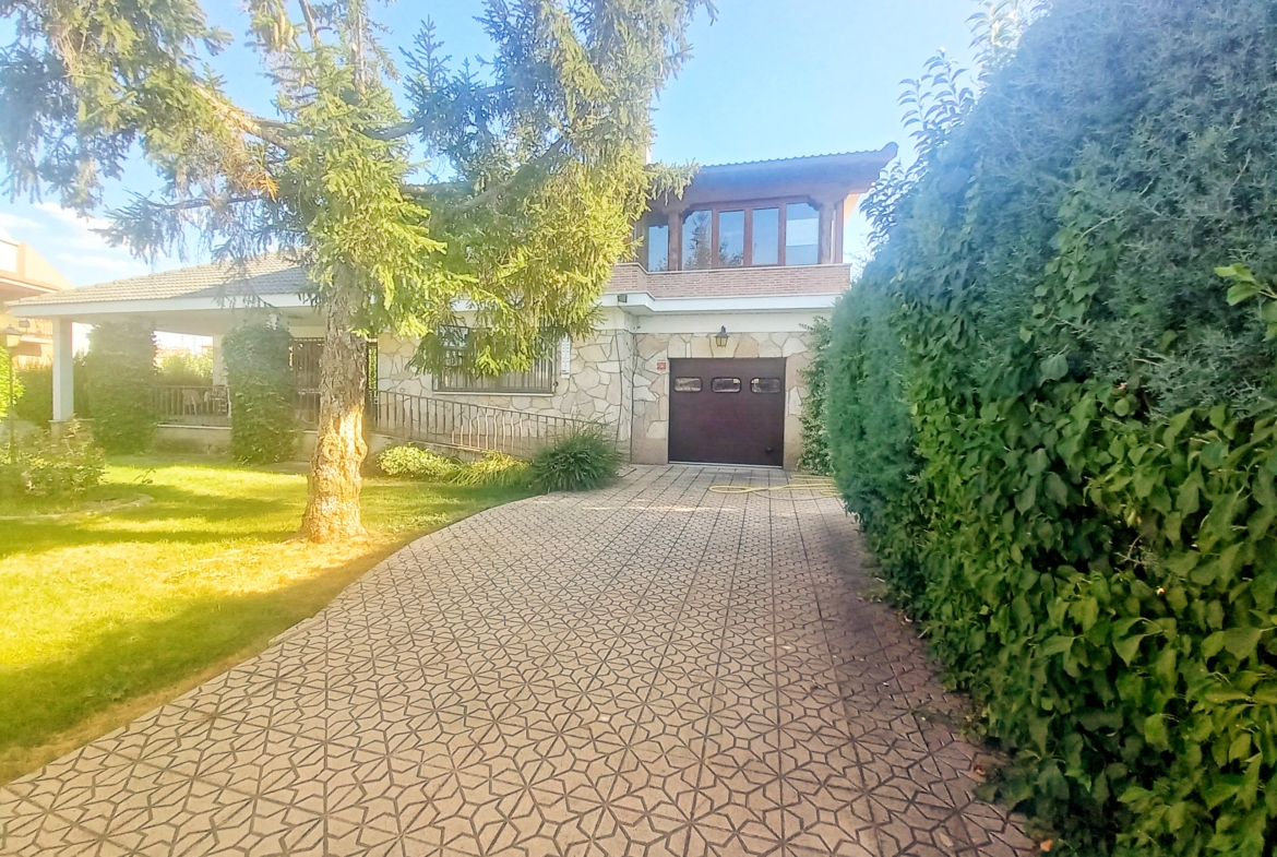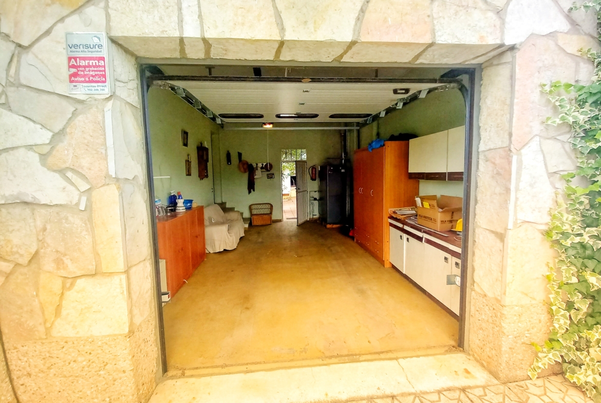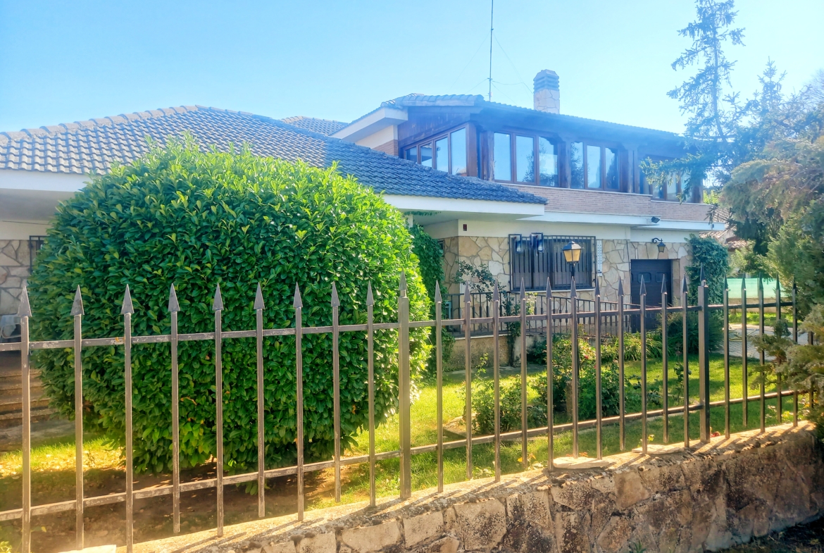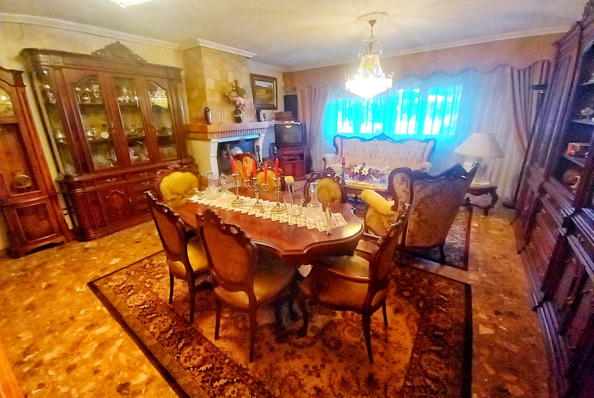 El chalet que traemos hoy es impresionante, consta de una parcela de 925 m2, y una edificación de 320 m2. Accedemos al chalet por una puerta de forja, con suficiente espacio para estacionar el vehículo, además enfrente vemos el garaje por si no queremos dejar el coche a la intemperie, observamos una rampa que nos da acceso a la casa además de unas escaleras. En el jardín nos encontramos un montón de terreno con césped, vemos un pozo, una piscina de construcción para refrescarnos en los días estivales. Nos topamos con un área con tres casetas de perros por si tenemos animales, varias casetas, dos para aperos de jardinería, otra mas grande como merendero, una parrilla exterior para nuestros asados, y una mesa de piedra para poder disfrutar de una buena comida o cena con toda la familia, nos topamos con una puerta de cristal que nos da acceso a otro gran terreno con pozo, con muchas posibilidades incluso para una huerta, damos la vuelta bordeando el chalet, volvemos a la rampa, accediendo a la casa, nos encontramos con un recibidor amplio. A la derecha nos topamos con un grandioso salón con una escalera y una puerta que nos comunica con el garaje, la escalera da subida a una sala grande con un despacho, una habitación de. matrimonio, otra habitación con un armario con cama abatible, un cuarto de baño totalmente equipado con bañera, comunicado por una puerta con una inmensa terraza acristalada con cristales climalit, con una gran iluminación, tiene espacio para todo. Volvemos a bajar y dejamos el salón atrás. Vamos a la cocina amplia y funcional totalmente equipada con todos los electrodomésticos incluso televisión, nos comunica con el patio, la parrilla y la mesa de piedra. Pasamos por un pasillo que desemboca en una estancia que comunica con dos habitaciones y dos cuartos de baño equipados, uno con plato de ducha y otro con bañera. También hay otra habitación que sirve como salita de estar o como comedor.