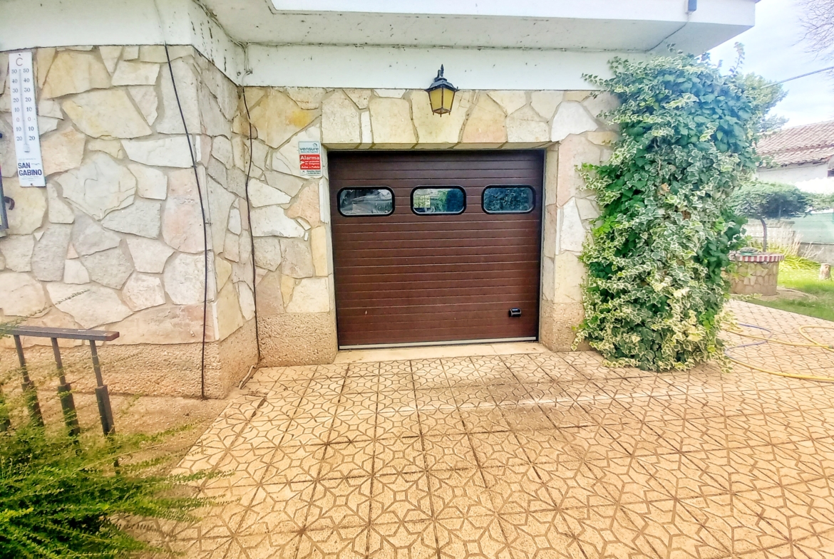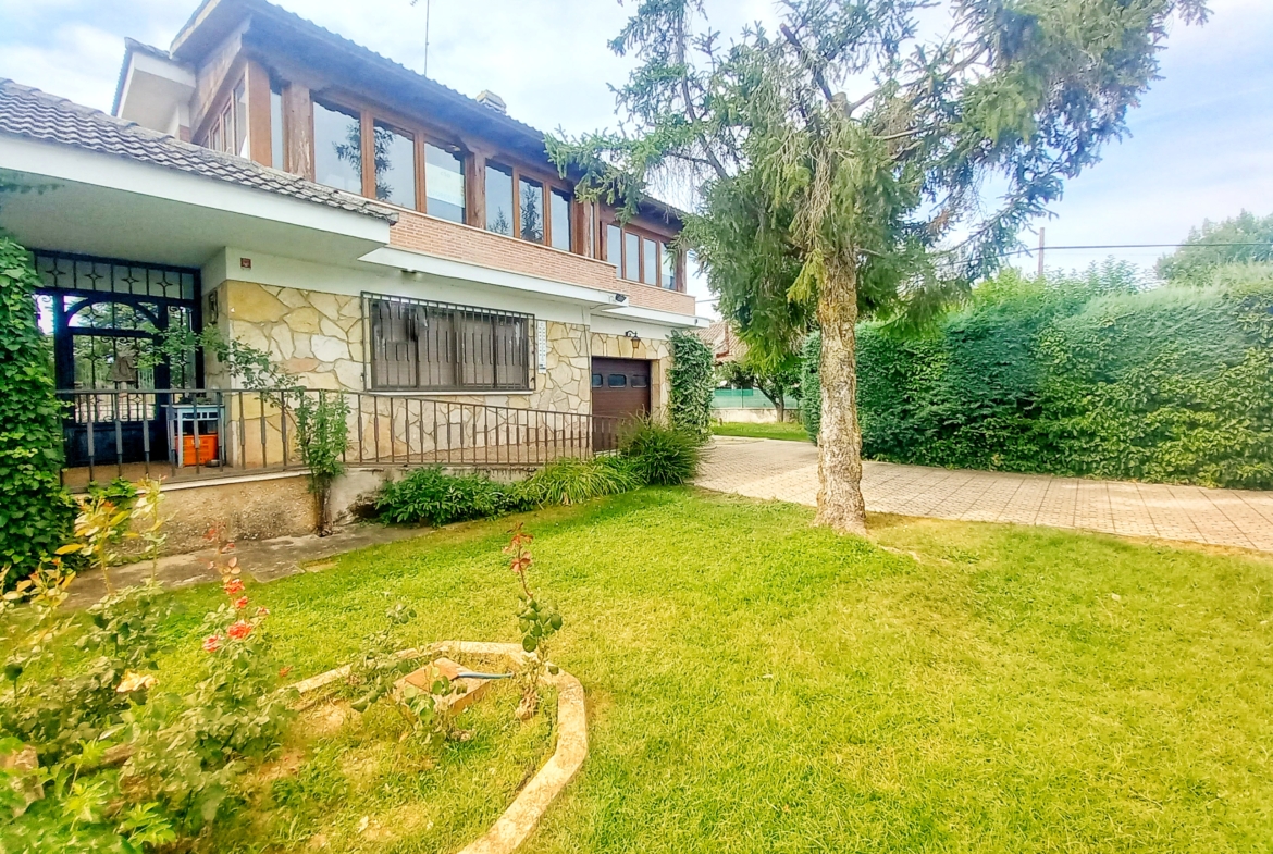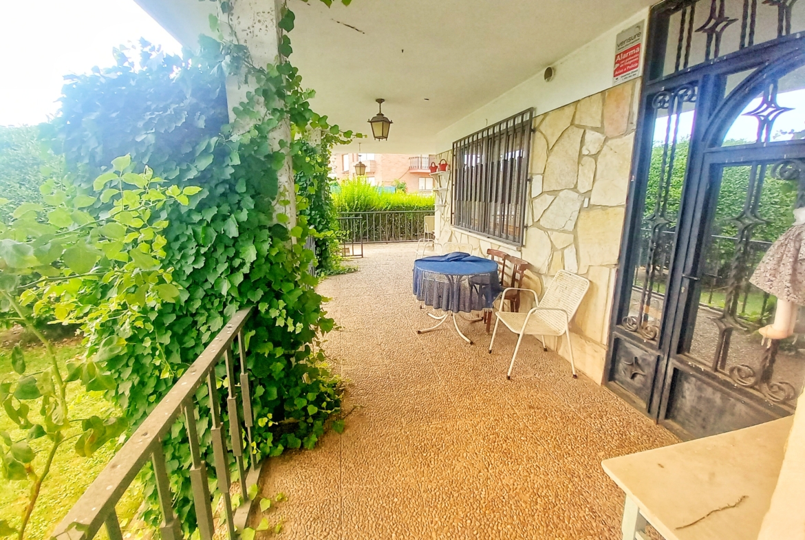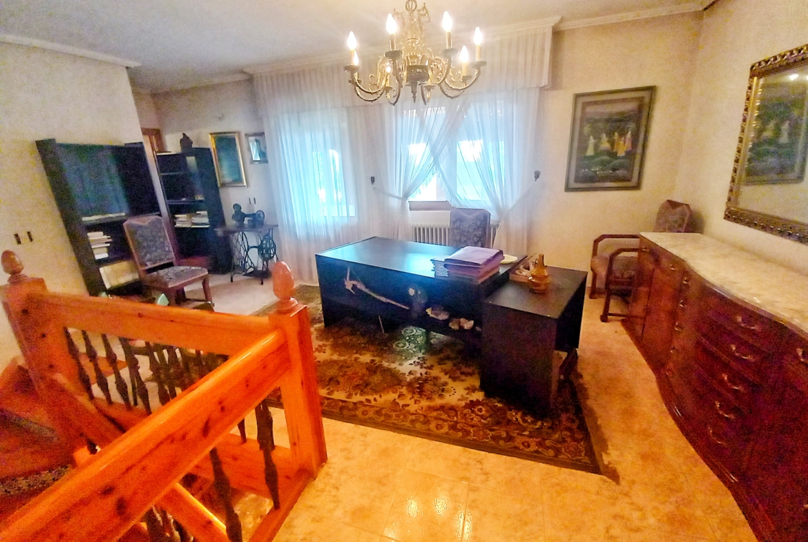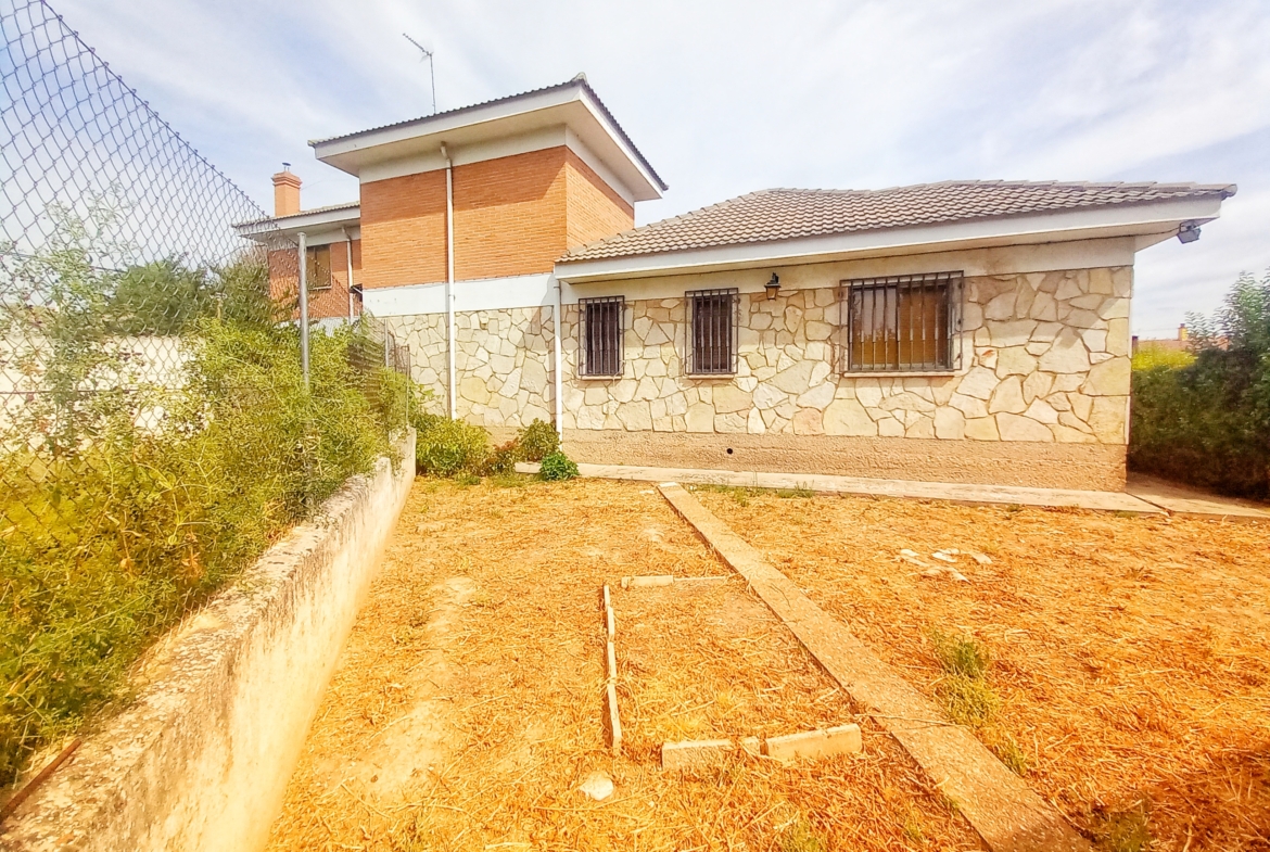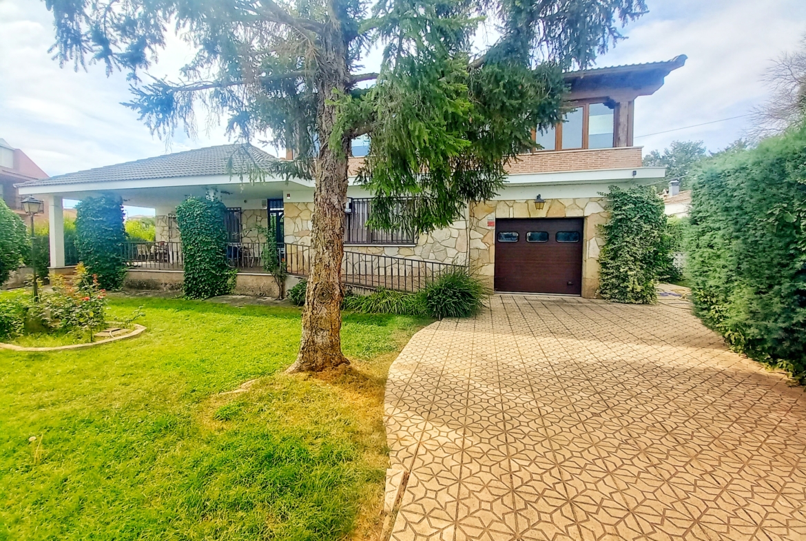 El chalet que traemos hoy es impresionante, consta de una parcela de 925 m2, y una edificación de 320 m2. Accedemos al chalet por una puerta de forja, con suficiente espacio para estacionar el vehículo, además enfrente vemos el garaje por si no queremos dejar el coche a la intemperie, observamos una rampa que nos da acceso a la casa además de unas escaleras. En el jardín nos encontramos un montón de terreno con césped, vemos un pozo, una piscina de construcción para refrescarnos en los días estivales. Nos topamos con un área con tres casetas de perros por si tenemos animales, varias casetas, dos para aperos de jardinería, otra mas grande como merendero, una parrilla exterior para nuestros asados, y una mesa de piedra para poder disfrutar de una buena comida o cena con toda la familia, nos topamos con una puerta de cristal que nos da acceso a otro gran terreno con pozo, con muchas posibilidades incluso para una huerta, damos la vuelta bordeando el chalet, volvemos a la rampa, accediendo a la casa, nos encontramos con un recibidor amplio. A la derecha nos topamos con un grandioso salón con una escalera y una puerta que nos comunica con el garaje, la escalera da subida a una sala grande con un despacho, una habitación de. matrimonio, otra habitación con un armario con cama abatible, un cuarto de baño totalmente equipado con bañera, comunicado por una puerta con una inmensa terraza acristalada con cristales climalit, con una gran iluminación, tiene espacio para todo. Volvemos a bajar y dejamos el salón atrás. Vamos a la cocina amplia y funcional totalmente equipada con todos los electrodomésticos incluso televisión, nos comunica con el patio, la parrilla y la mesa de piedra. Pasamos por un pasillo que desemboca en una estancia que comunica con dos habitaciones y dos cuartos de baño equipados, uno con plato de ducha y otro con bañera. También hay otra habitación que sirve como salita de estar o como comedor.