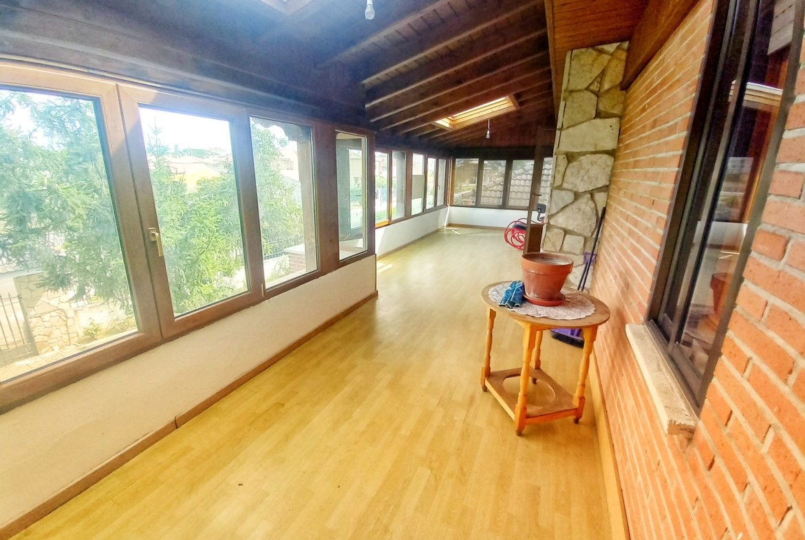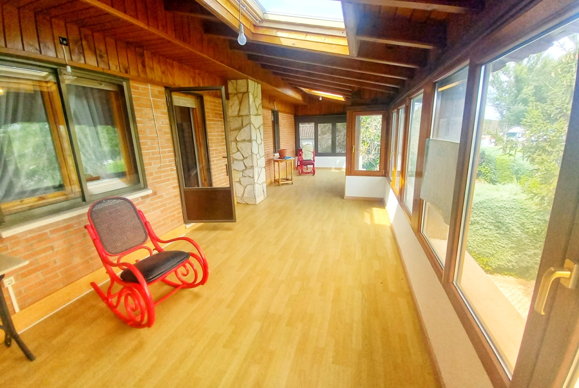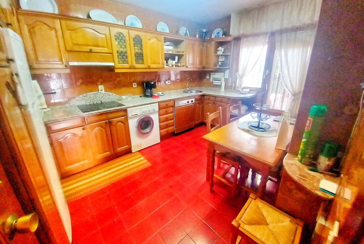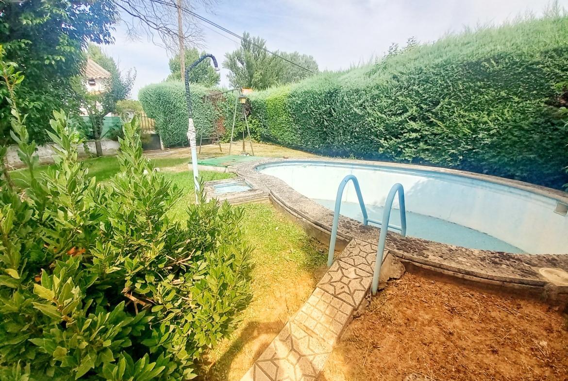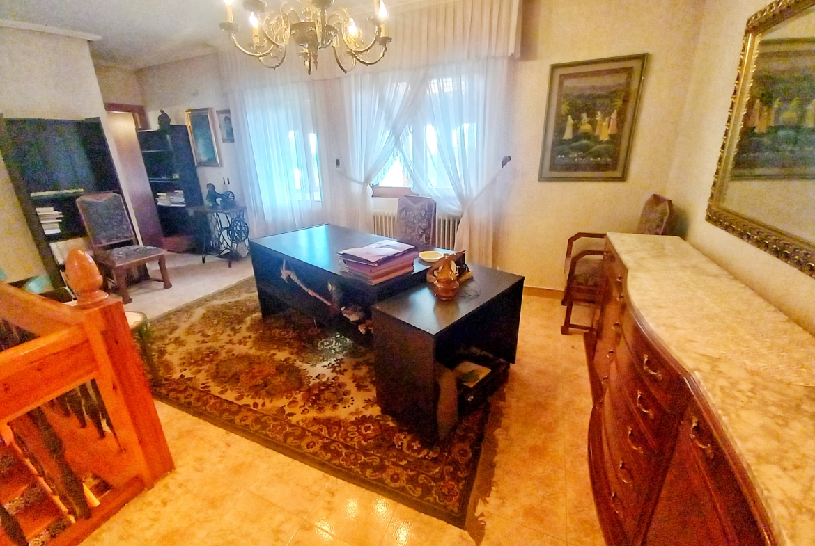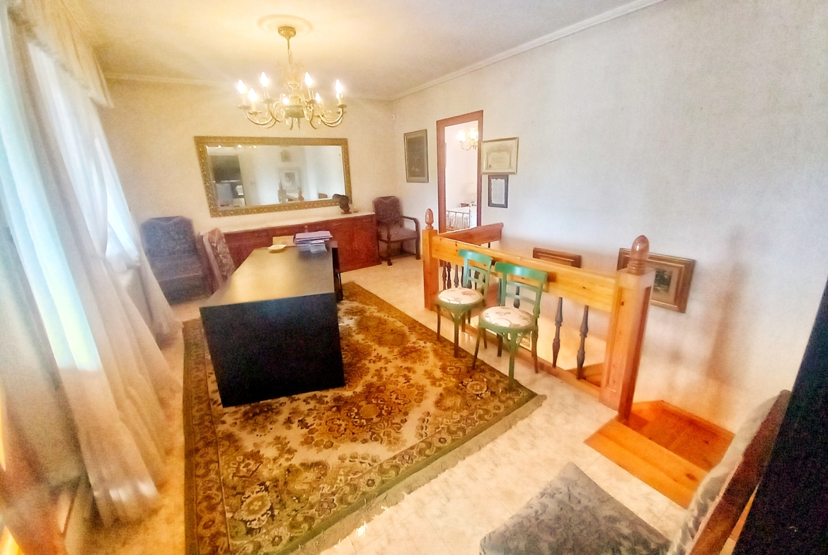 El chalet que traemos hoy es impresionante, consta de una parcela de 925 m2, y una edificación de 320 m2. Accedemos al chalet por una puerta de forja, con suficiente espacio para estacionar el vehículo, además enfrente vemos el garaje por si no queremos dejar el coche a la intemperie, observamos una rampa que nos da acceso a la casa además de unas escaleras. En el jardín nos encontramos un montón de terreno con césped, vemos un pozo, una piscina de construcción para refrescarnos en los días estivales. Nos topamos con un área con tres casetas de perros por si tenemos animales, varias casetas, dos para aperos de jardinería, otra mas grande como merendero, una parrilla exterior para nuestros asados, y una mesa de piedra para poder disfrutar de una buena comida o cena con toda la familia, nos topamos con una puerta de cristal que nos da acceso a otro gran terreno con pozo, con muchas posibilidades incluso para una huerta, damos la vuelta bordeando el chalet, volvemos a la rampa, accediendo a la casa, nos encontramos con un recibidor amplio. A la derecha nos topamos con un grandioso salón con una escalera y una puerta que nos comunica con el garaje, la escalera da subida a una sala grande con un despacho, una habitación de. matrimonio, otra habitación con un armario con cama abatible, un cuarto de baño totalmente equipado con bañera, comunicado por una puerta con una inmensa terraza acristalada con cristales climalit, con una gran iluminación, tiene espacio para todo. Volvemos a bajar y dejamos el salón atrás. Vamos a la cocina amplia y funcional totalmente equipada con todos los electrodomésticos incluso televisión, nos comunica con el patio, la parrilla y la mesa de piedra. Pasamos por un pasillo que desemboca en una estancia que comunica con dos habitaciones y dos cuartos de baño equipados, uno con plato de ducha y otro con bañera. También hay otra habitación que sirve como salita de estar o como comedor.