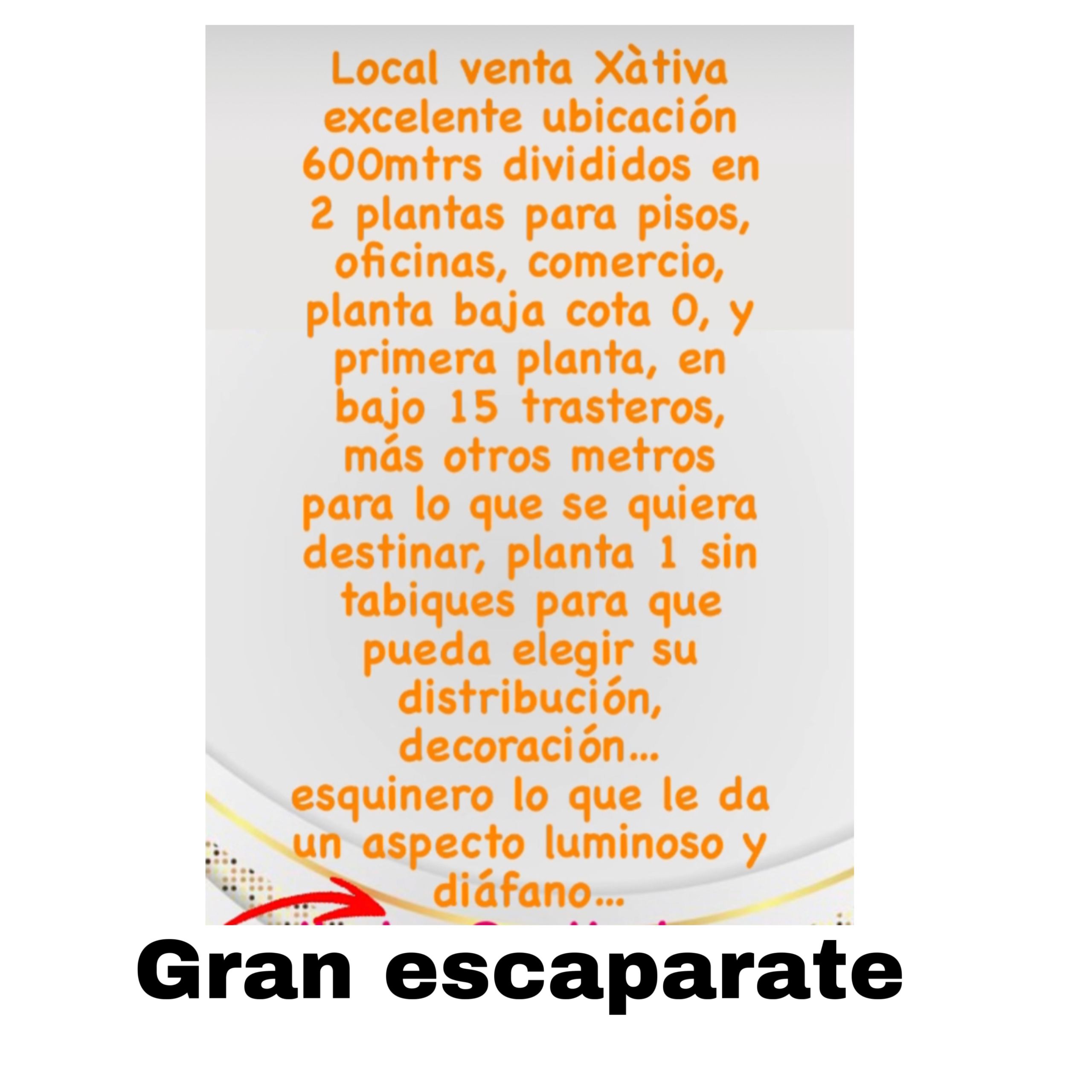 Local en venta en Xàtiva excelente ubicación 600mtrs para divididos en 2 plantas para pisos, oficinas, comercio planta baja cota 0, y primera planta, en bajo 15 trasteros, más otros metros para lo que se quiera destinar, planta 1 sin tabiques para que pueda elegir su distribución, decoración etc… las 2 plantas hacen esquina lo que le da un aspecto luminoso y diáfano con grandísimo escaparate